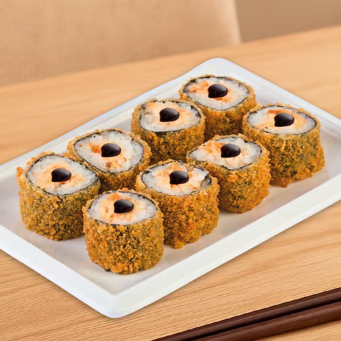 Enrolado empanado com recheio de kani, cream cheese e molho tarê (6 unids).