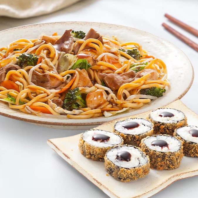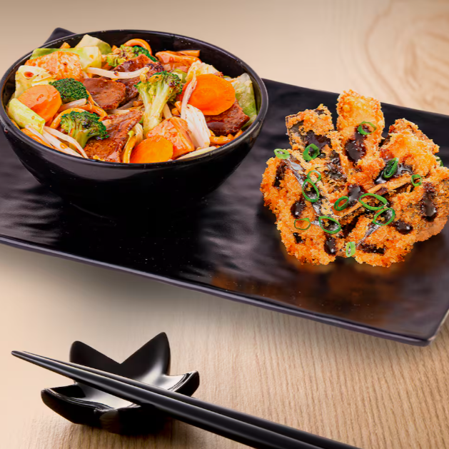 Macarrão oriental com carne, frango e legumes ao molho de soja + Enrolado empanado com salmão, cream cheese, cebolinha e molho tarê (6 unidades).