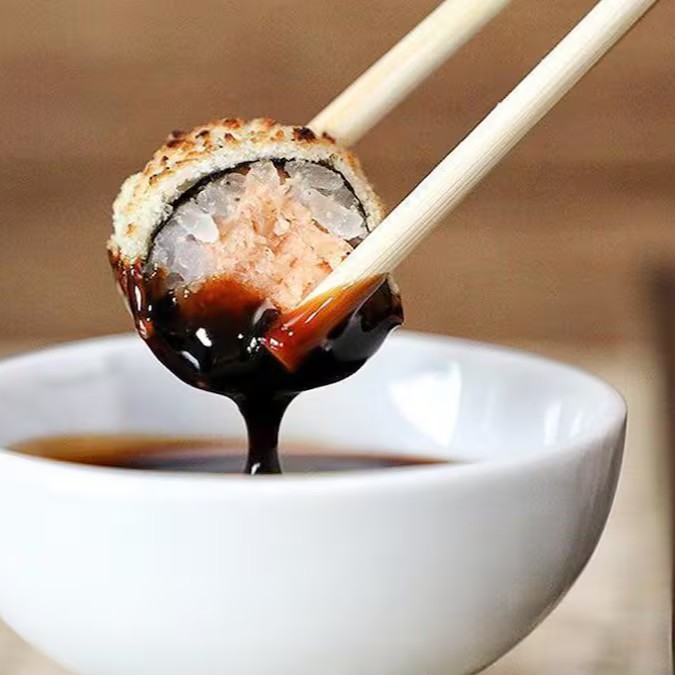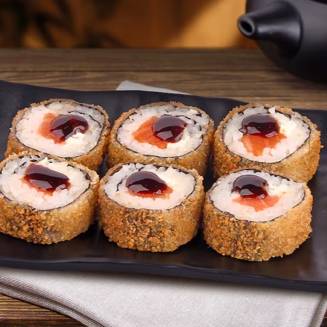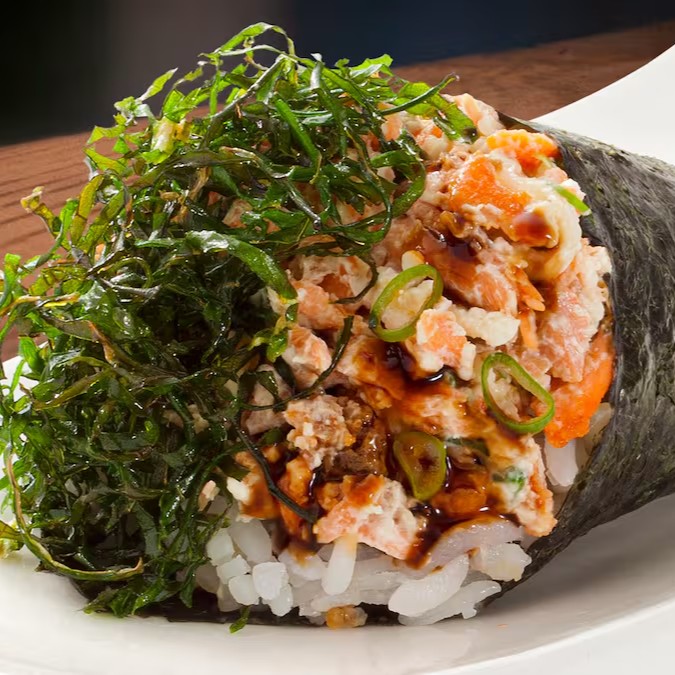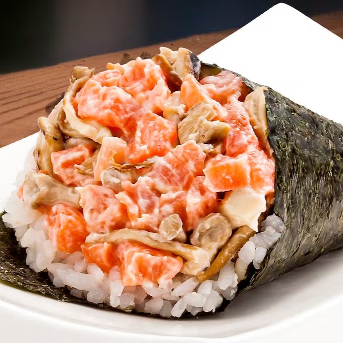 Arroz de sushi (shari) envolto em alga nori, com recheio de salmão grelhado, desfiado e misturado com cream cheese e cebolinha e molho tarê. Temaki empanado e frito.