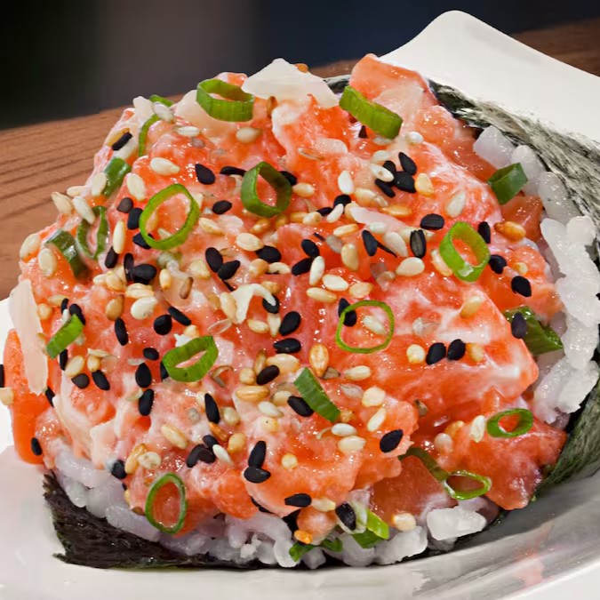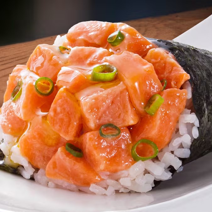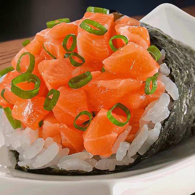 Arroz de sushi (shari) envolto em alga nori, recheado com ceviche de salmão, cebola roxa, pimenta, cebolinha, limão e azeite.