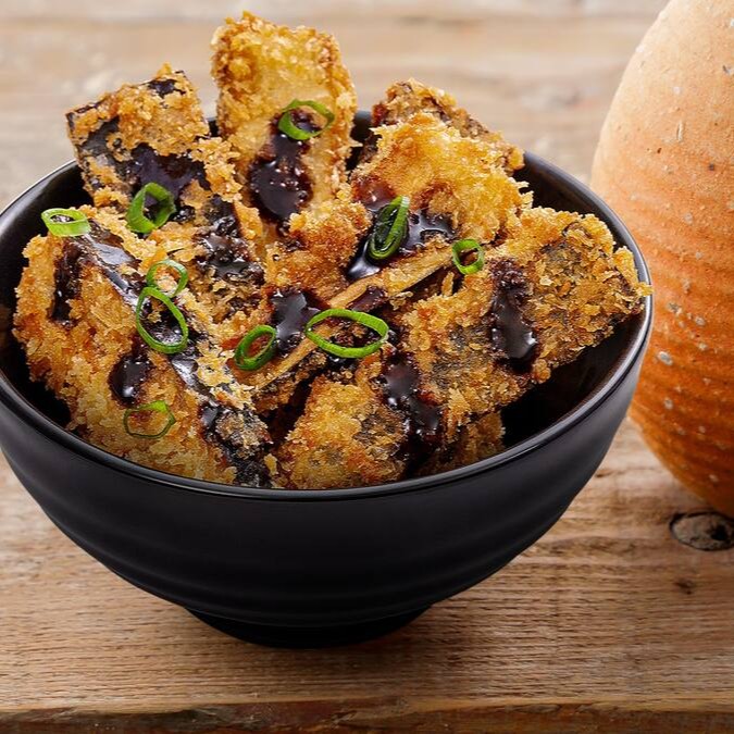 Berinjela empanada com farinha crocante, molho tonkatsu e cebolinha - 5 unidades (Prato Vegetariano).