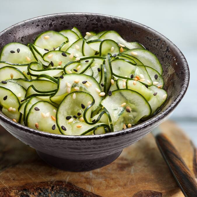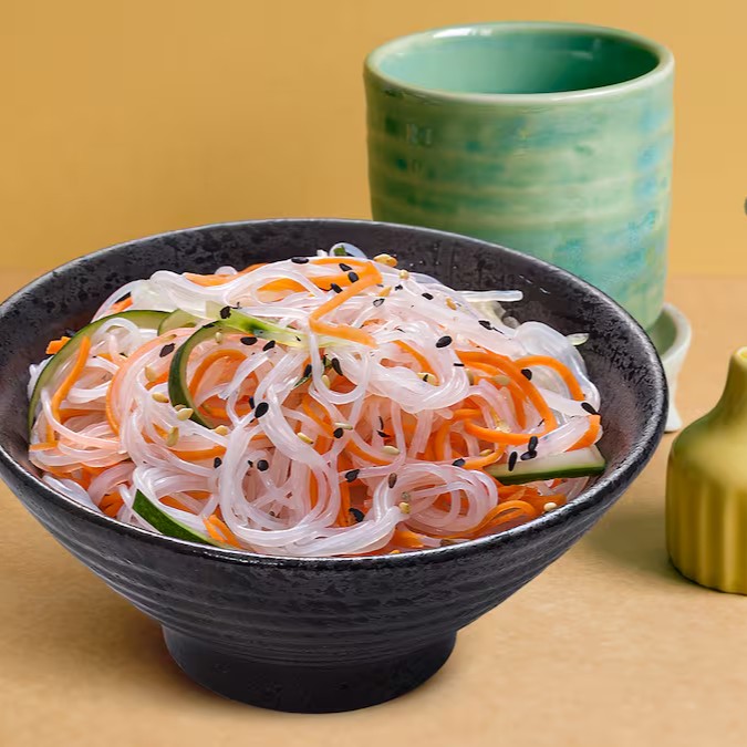 Salada oriental de harusame, pepino, cenoura e gergelim (Prato Vegetariano).