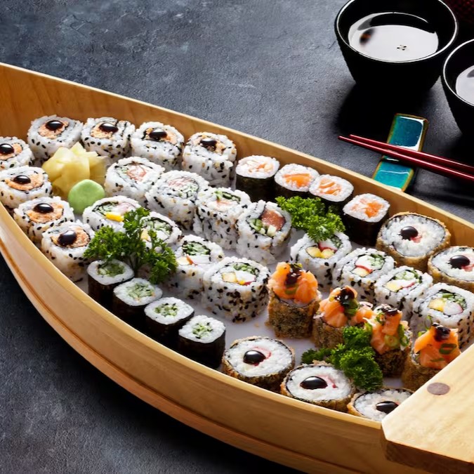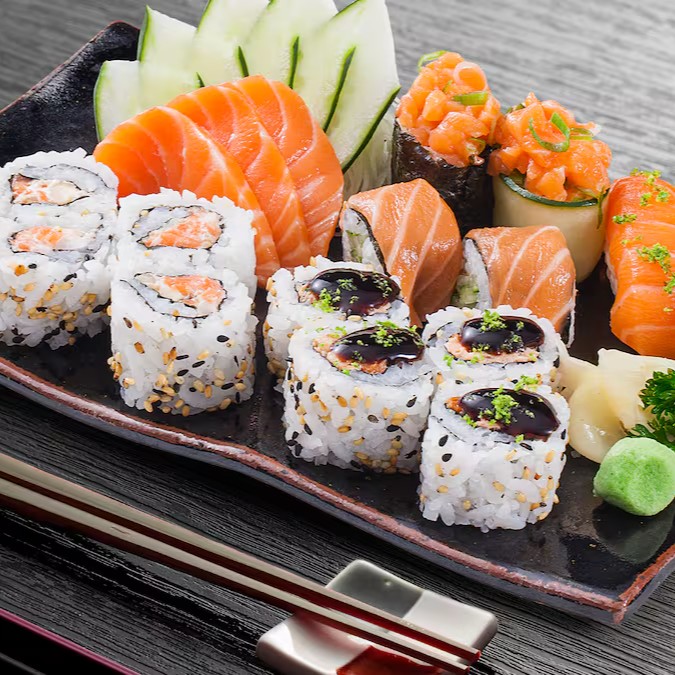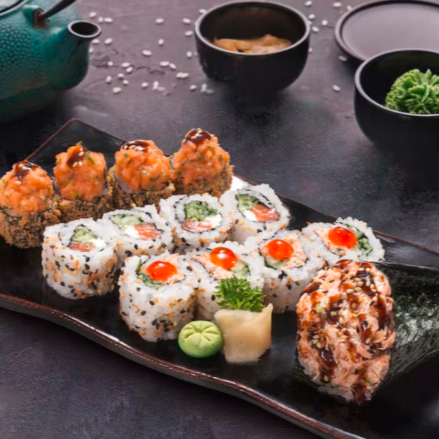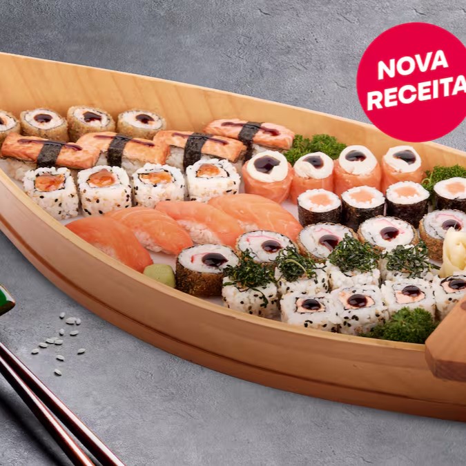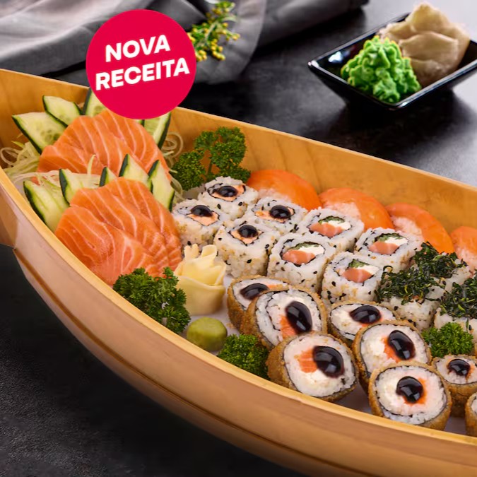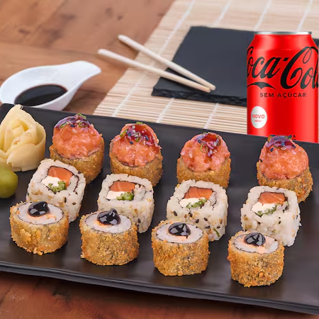 8 uramaki de salmão grelhado + 8 califórnia uramaki + 4 uramaki de salmão com pepino e cream cheese + 6 hot roll kani + 4 mini hot roll com tataki + 4 kappamaki + 4 hossomaki (38 unids).