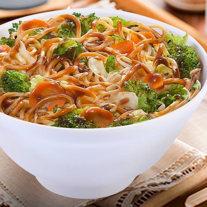 Macarrão oriental com legumes ao molho de soja. Contém acelga, brócolis, cenoura, moyahi (broto de feijão) e repolho (Prato Vegetariano).