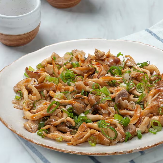 Cogumelos orientais na manteiga com cebolinha e molho à base de shoyu.