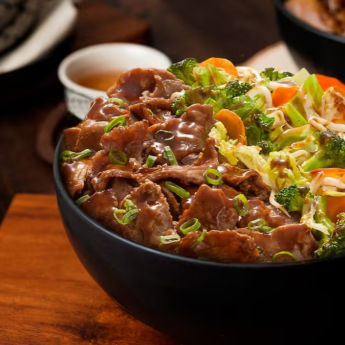 Arroz japonês (gohan) com carne, frango e legumes refogados no molho à base de shoyu.