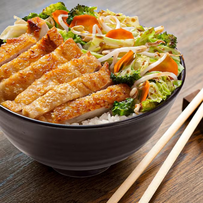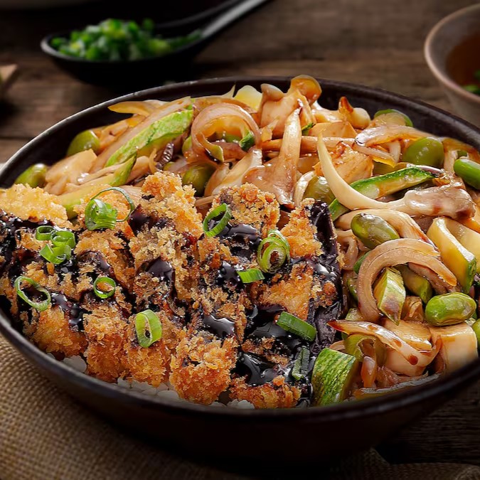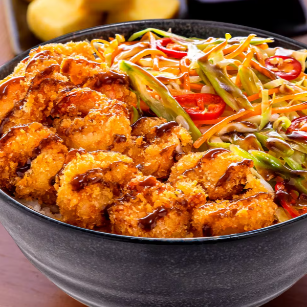 Arroz japonês (gohan) + camarão empanado com molho tonkatsu + legumes refogados em molho à base de shoyu. Opção: Molho picante.