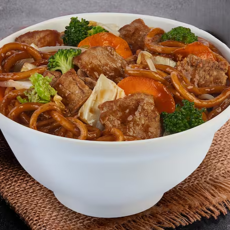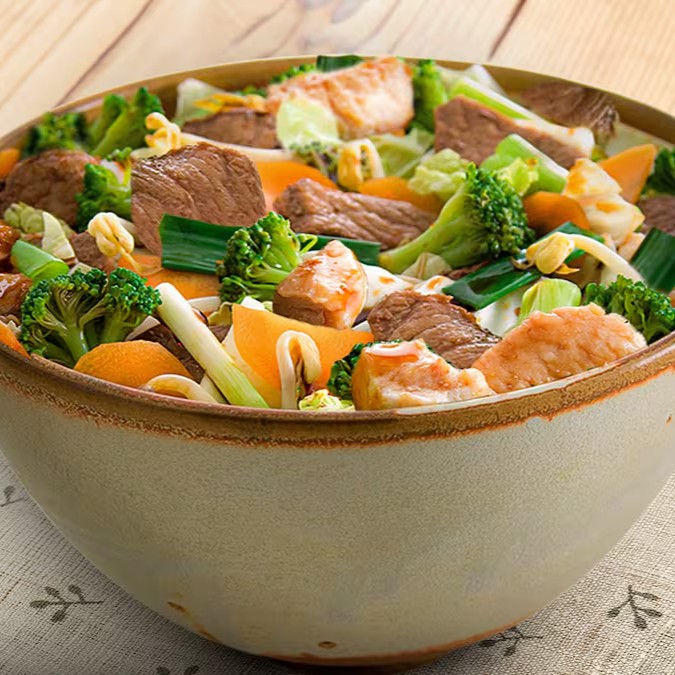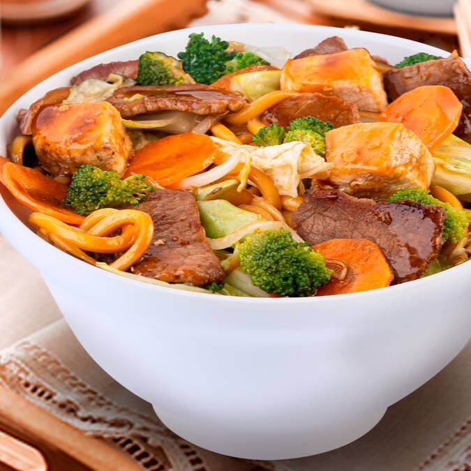 Macarrão oriental com carne, frango e legumes ao molho de soja. Contém acelga, brócolis, cenoura, moyahi (broto de feijão) e repolho.