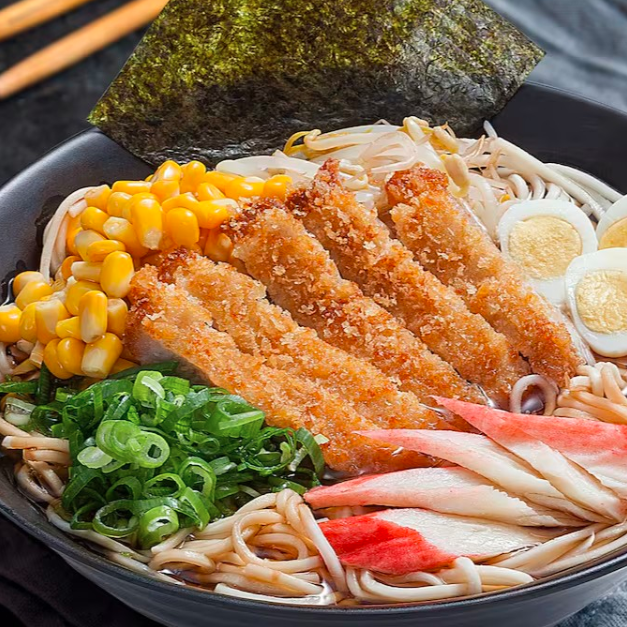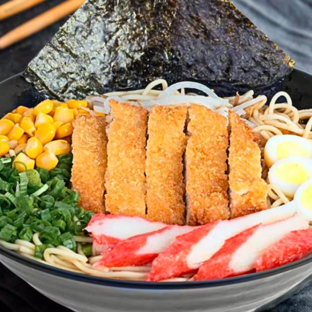 ovos de codorna, milho, moyashi, cebolinha, nori + chicken katsu