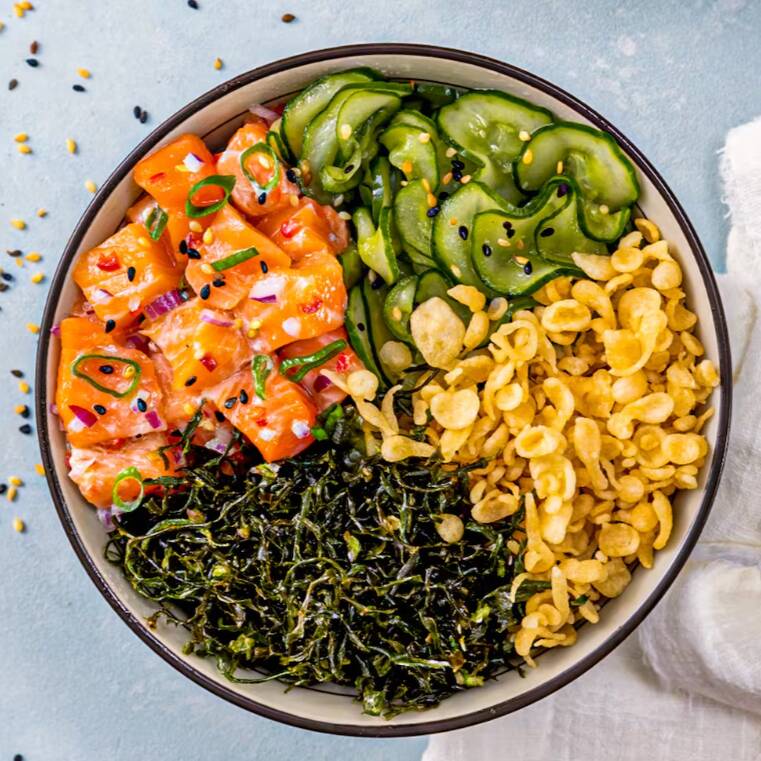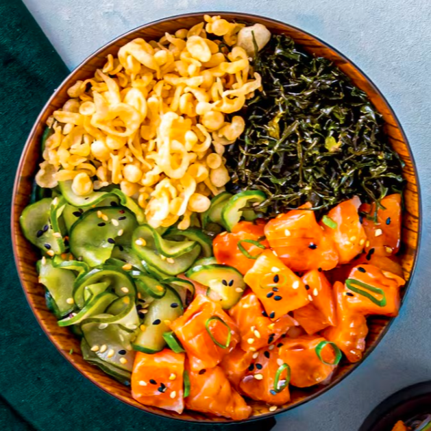 Base e tamanho à sua escolha, ceviche de salmão (salmão, cebola roxa, pimenta, cebolinha, limão e azeite), sunomono, couve crispy, crispy de tempurá e gergelim.