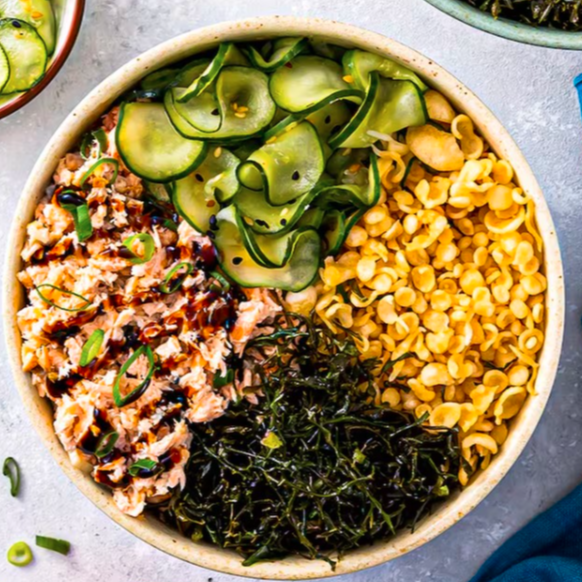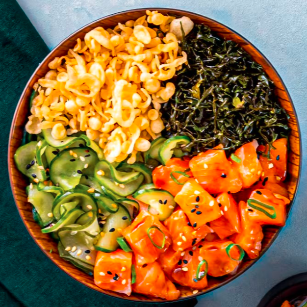 Base à sua escolha, salmão grelhado e desfiado misturado com cream cheese e cebolinha, coberto com molho tarê, sunomono, couve crispy, crispy de tempurá e gergelim (Prato Frio).