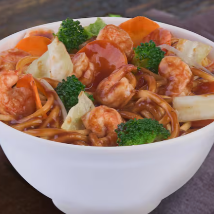 Macarrão oriental com camarão, carne, frango e legumes ao molho de soja. (Novo molho)