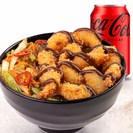 Arroz japonês (gohan) + camarão empanado com molho tonkatsu + legumes refogados em molho à base de shoyu. Opção: Molho picante, e uma cola - cola lata pra acompanhar