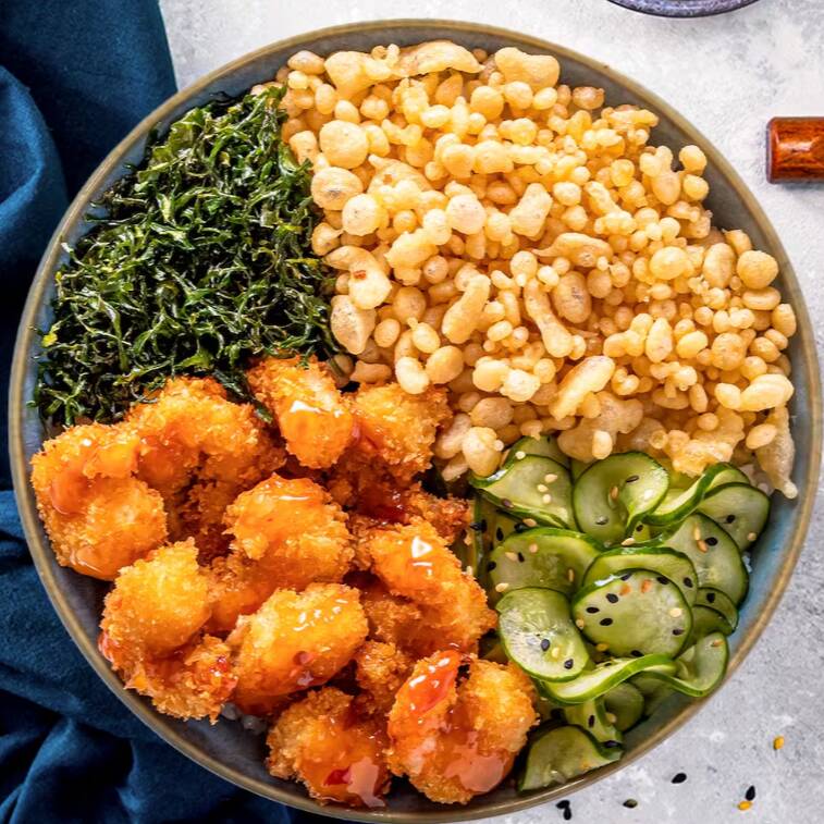 Base e tamanho à sua escolha, camarão empanado com molho sweet chilli, sunomono, couve crispy, crispy de tempurá, tomate cereja, cream cheese e gergelim.