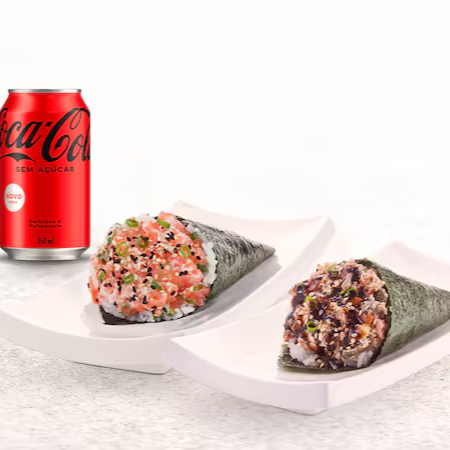 4 mini hot + 4 uramaki de salmão com pepino e cream cheese + 4 mini hot com tataki + uma Coca-Cola lata para acompanhar.