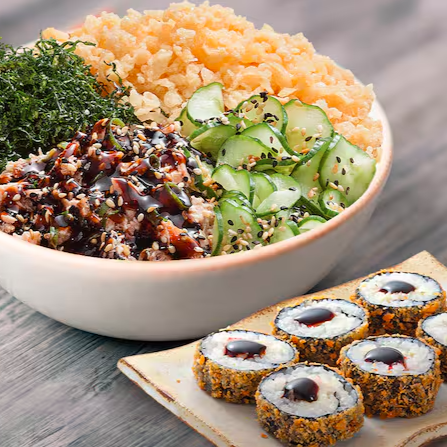 Base à sua escolha (arroz de sushi, salada ou salada oriental), misturado com cream cheese e cebolinha, coberto com molho tarê, sunomono, couve crispy, crispy de tempurá e gergelim + 6 hot roll kani. (Prato frio)