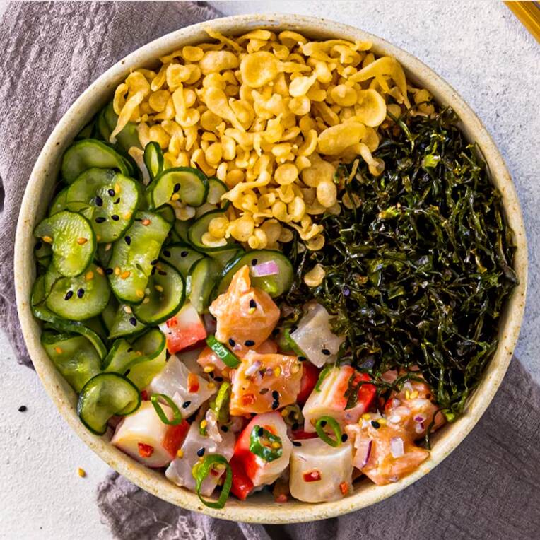 Base e tamanho à sua escolha, ceviche mix (mix de peixe e kani, cebola roxa, pimenta, cebolinha e limão), sunomono, couve crispy, crispy de tempurá, tomate cereja, cream cheese e gergelim.