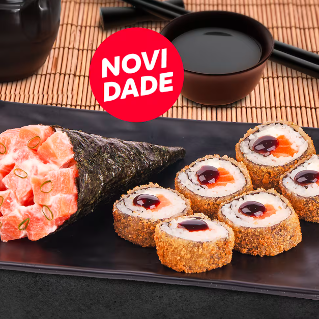 1 temaki de salmão grelhado + 4 uramaki de salmão com pepino e cream cheese + 4 fresh uramaki com molho sweet chilli + 4 mini hot roll com tataki (13 unidades).