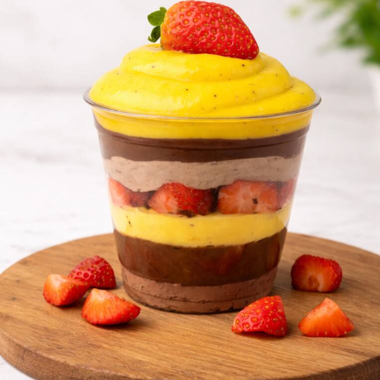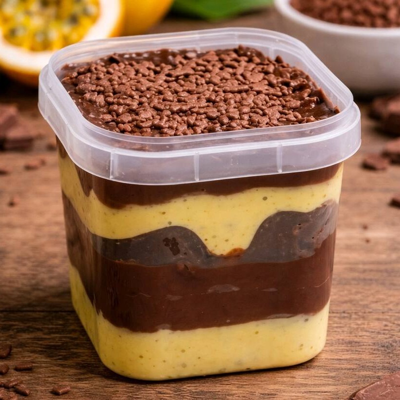 Esse potinho é pura tentação: camadas generosas de bolo molhadinho, creme de maracujá levemente azedinho pra equilibrar, e aquele brigadeiro de chocolate bem cremoso que derrete na boca. Finalizado com granulado pra dar o toque especial.