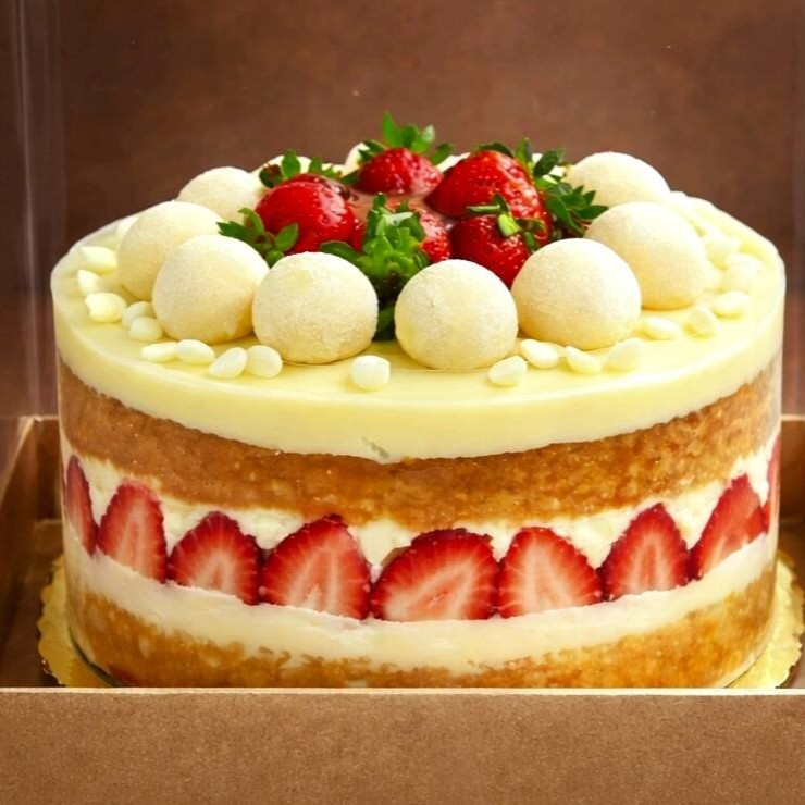 Com aproximadamente 1,5 kg, ele serve entre 7 a 8pessoas. A massa é de baunilha, super macia e levemente molhadinha. No interior, morangos frescos aparecem como uma deliciosa surpresa, trazendo leveza e frescor a cada fatia.