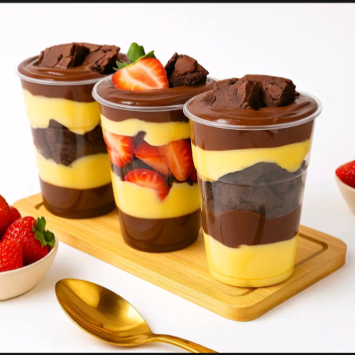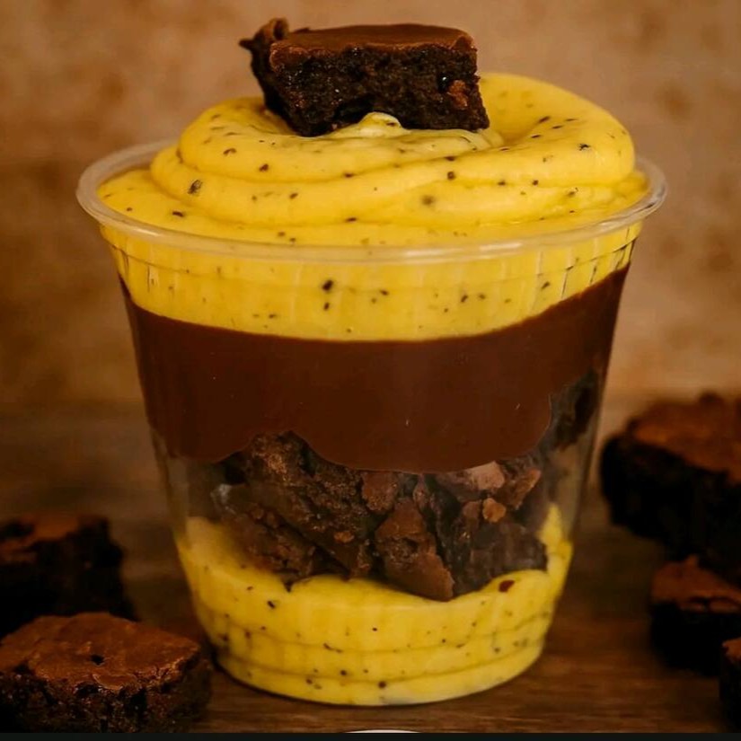 Uma sobremesa encantadora, montada em camadas generosas de brigadeiro cremoso de maracujá, combinadas com pedaços de brownie artesanal e morangos frescos, trazendo um contraste perfeito entre doçura e frescor.