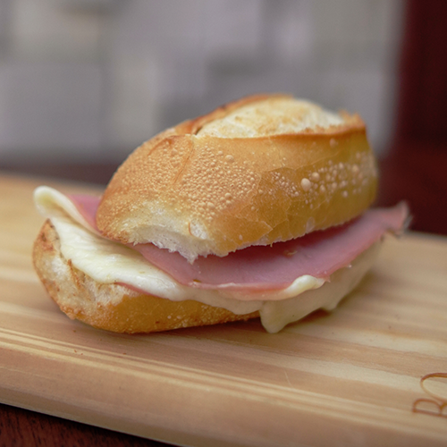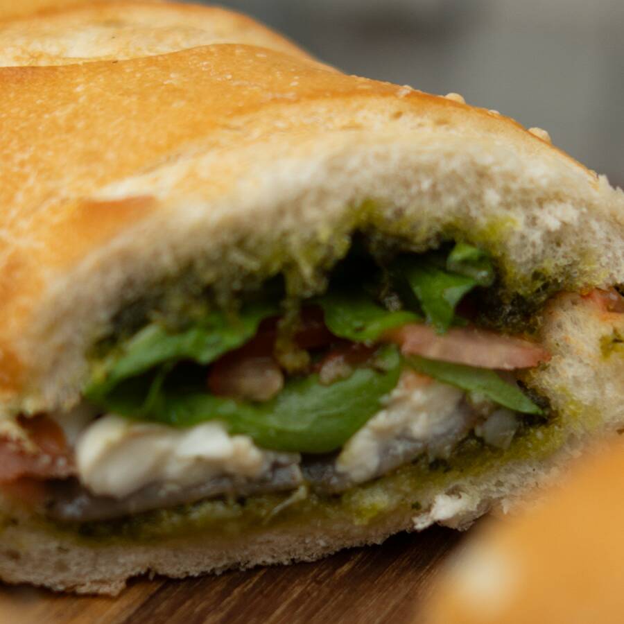 Pão Baguetinho com recheio de Frango, Queijo Mussarela, Alface Americana, Molho Pesto