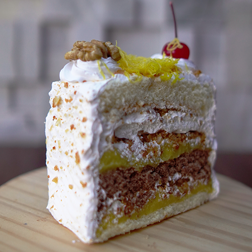 Bolo Marta rocha com Massa Pão de Ló, Crocante, creme de Ovos e Suspiro