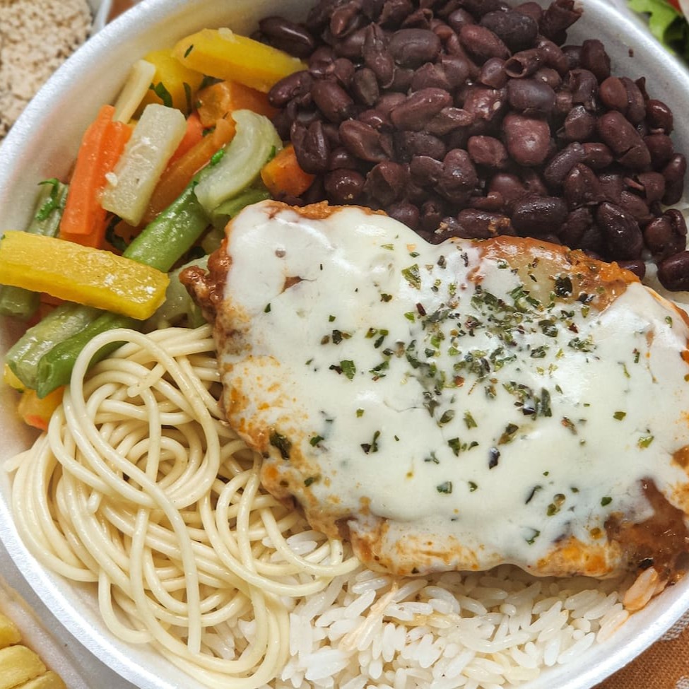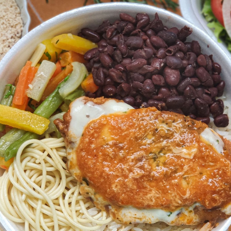 Foto real! Marmita com parmegiana de frango acompanhado de feijão preto, espaguete ao alho e óleo e refogado doa Dia.