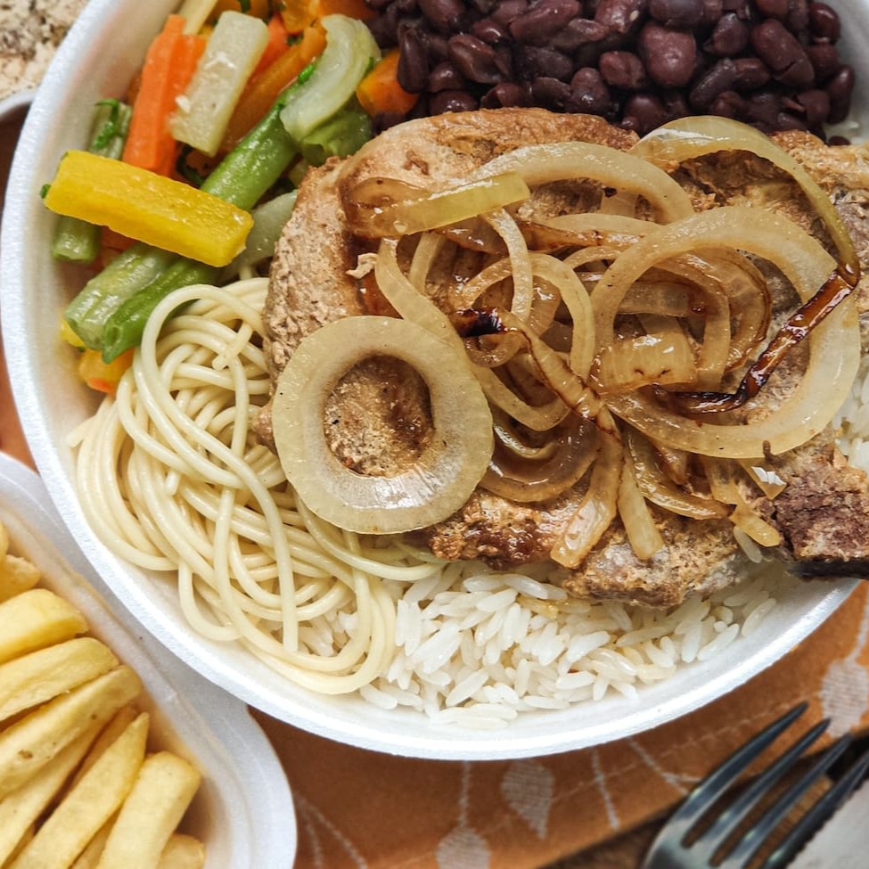 Foto real! Marmita com bife acebolado acompanhado de feijão preto, espaguete ao alho e óleo e refogado doa Dia.