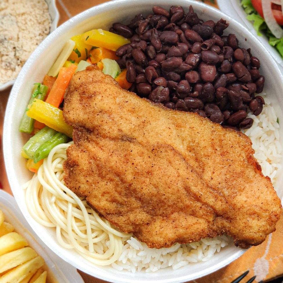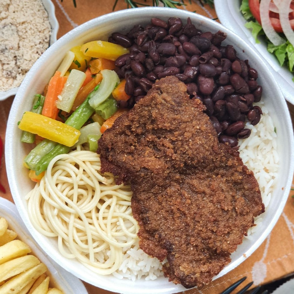 Foto real Marmita com frango à milanesa acompanhado de feijão preto, arroz branco, espaguete ao alho e óleo e refogado do Dia.