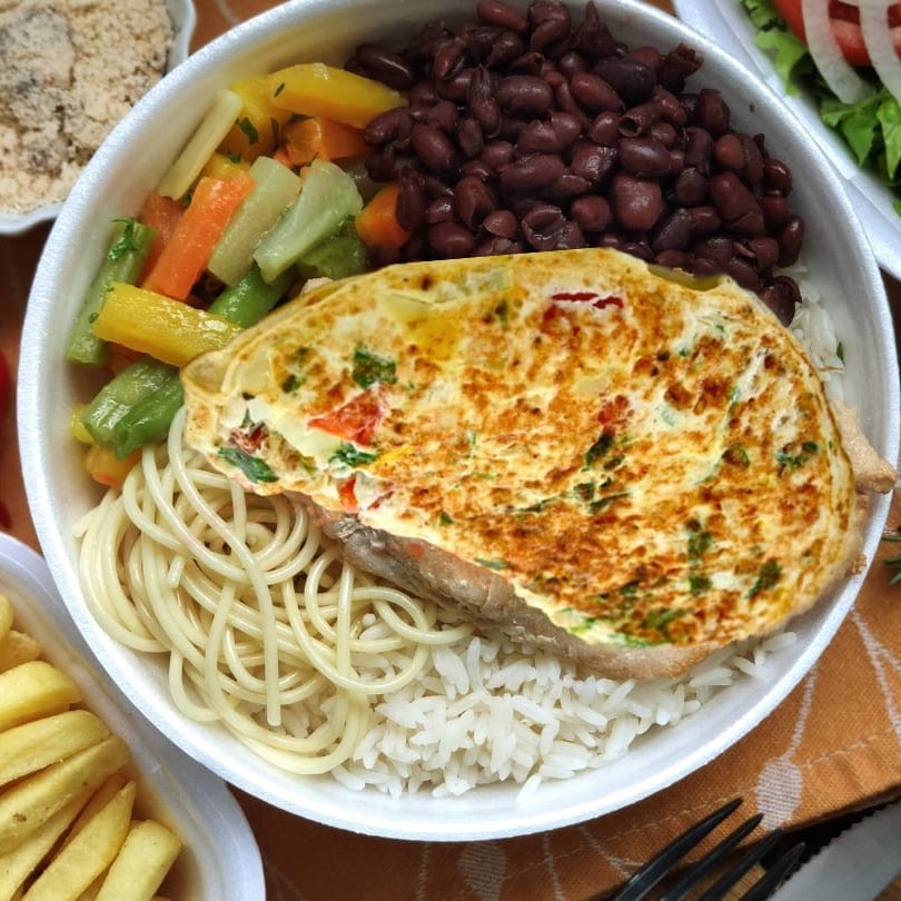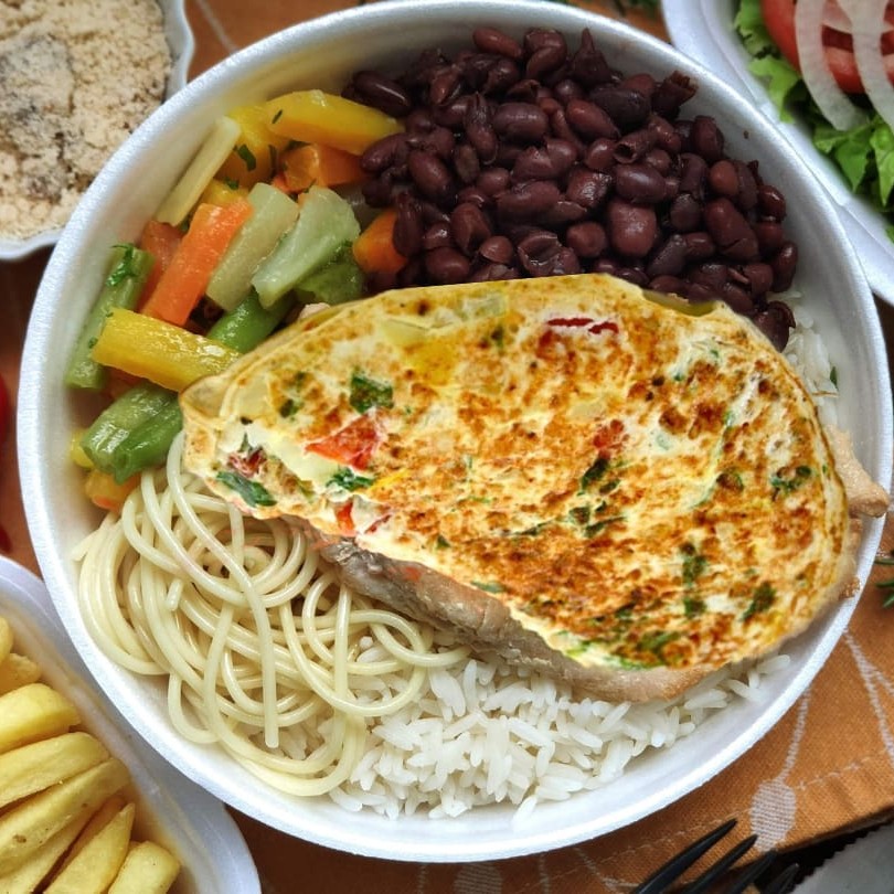 Descrição Foto real! Marmita com omelete recheado com queijo muzzarela acompanhado de feijão preto, espaguete ao alho e óleo e refogado do Dia. Com direito a uma coca lata de 350 ml.