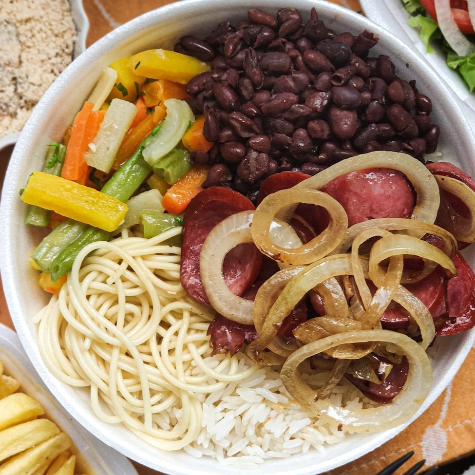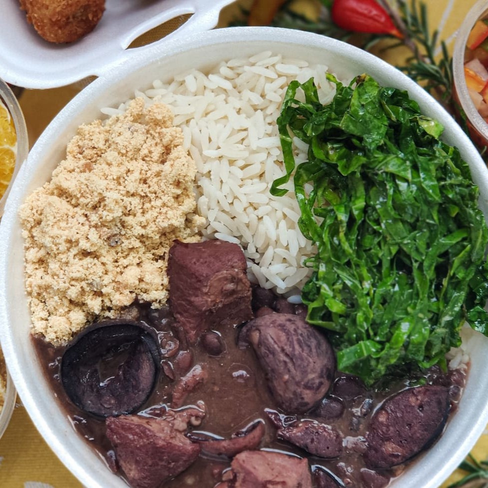 Essa é a nossa versão de feijoadinha! O feijão é temperado como uma superfeijoada, contém lombinho, paio e calabresa acompanhada de arroz branco bem soltinho, farofa de bacon e couve refogada. Uma opção baratinha para quem quer curtir uma feijoada e pagar bem pouco.