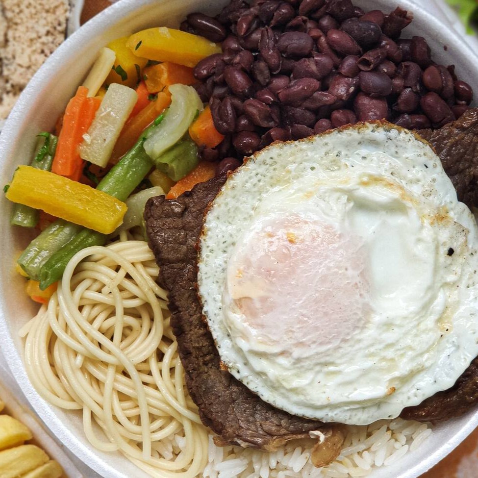 Foto real! Marmita com bife à cavalo acompanhado de feijão preto, espaguete ao alho e óleo e refogado doa Dia.