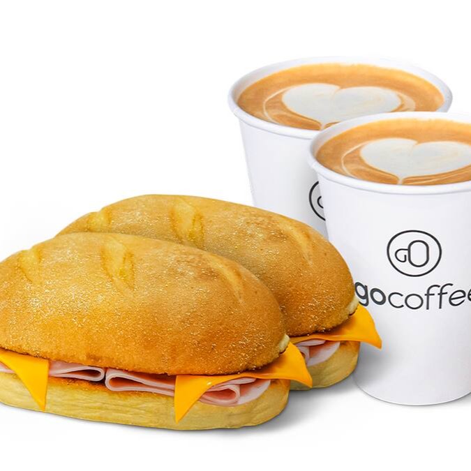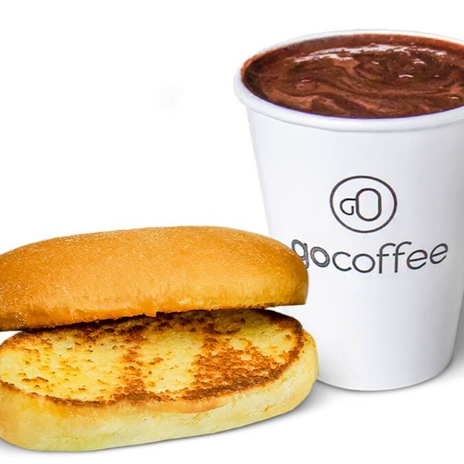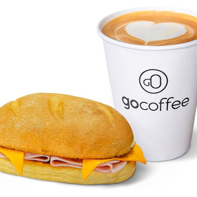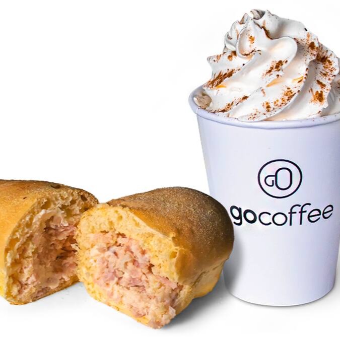 Um cappuccino Go Coffee grande acompanhado de um toast recheado