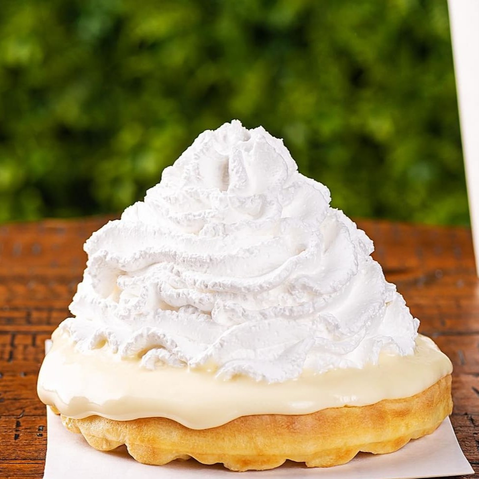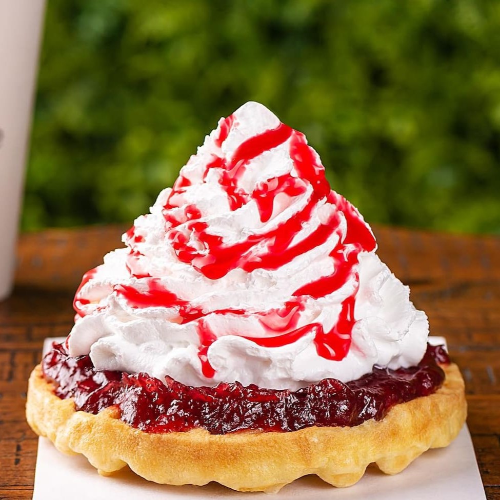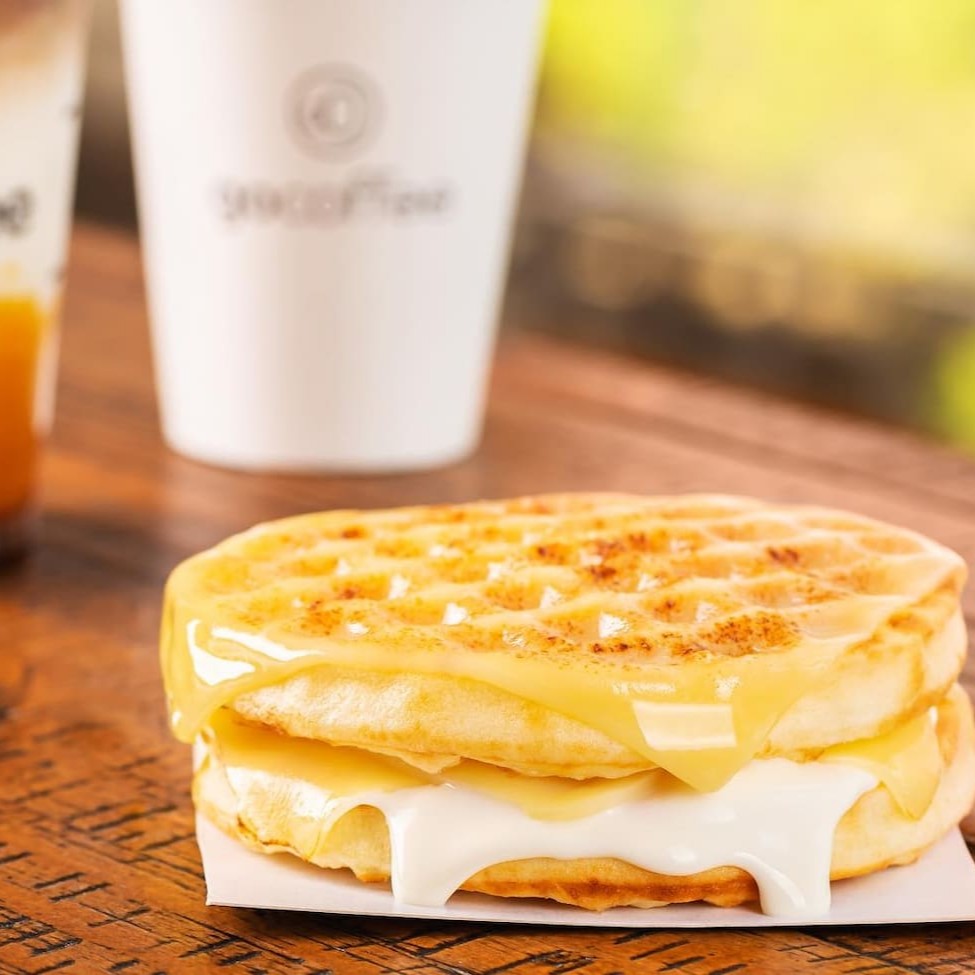 Waffle recheado com cream cheese, queijo muçarela. Finalizado com queijo muçarela maçaricado