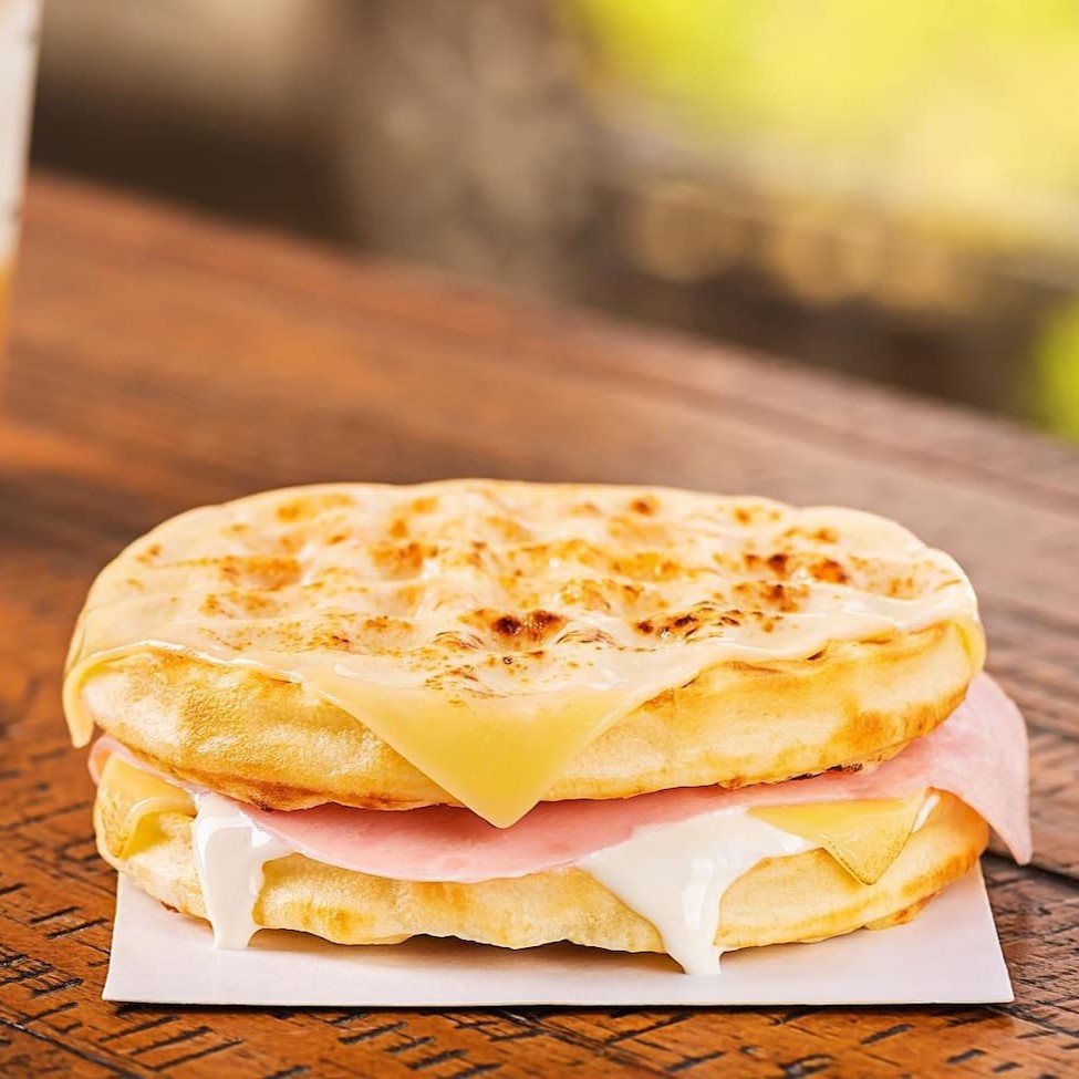 Pão com manteiga na chapa, recheado com queijo e presunto