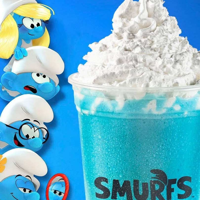 Divertido frappe com base de creme + xarope de blueberry + leite + gelo e chantilly.