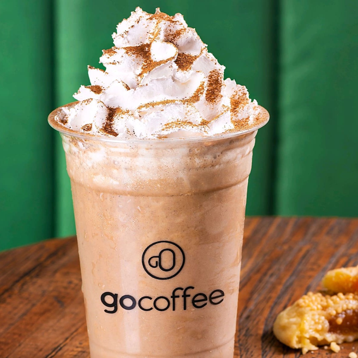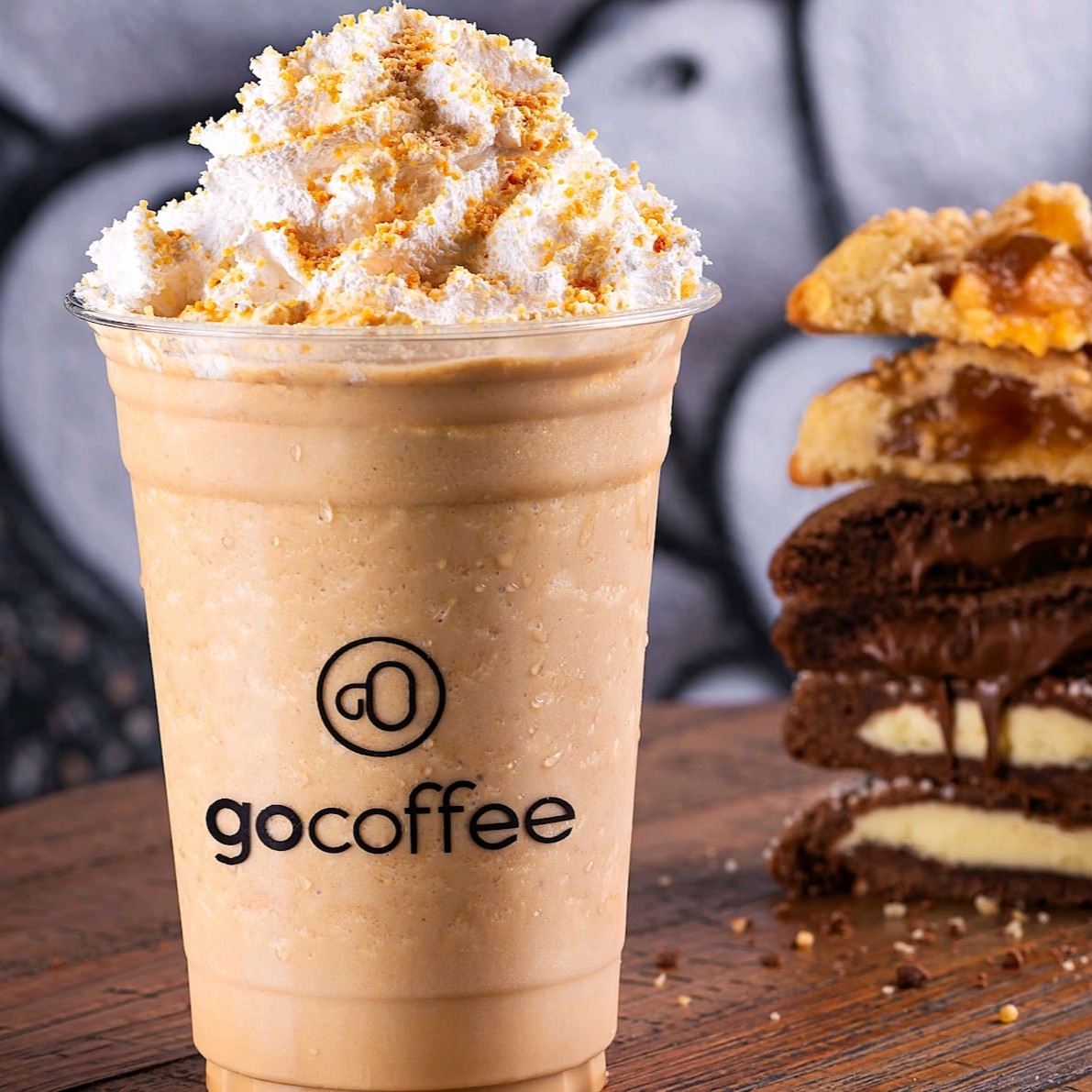 Paçoca \o/ Base café ou creme + syrup + leite + gelo +chantilly + cobertura. Café e chantilly são opcionais. O Chantilly é enviado em um potinho separado.
