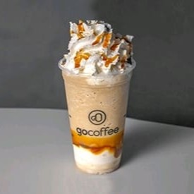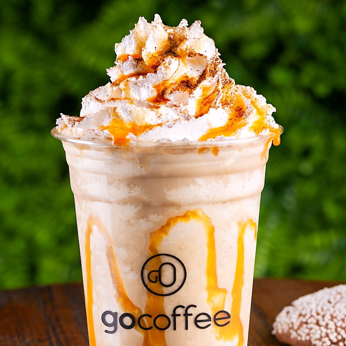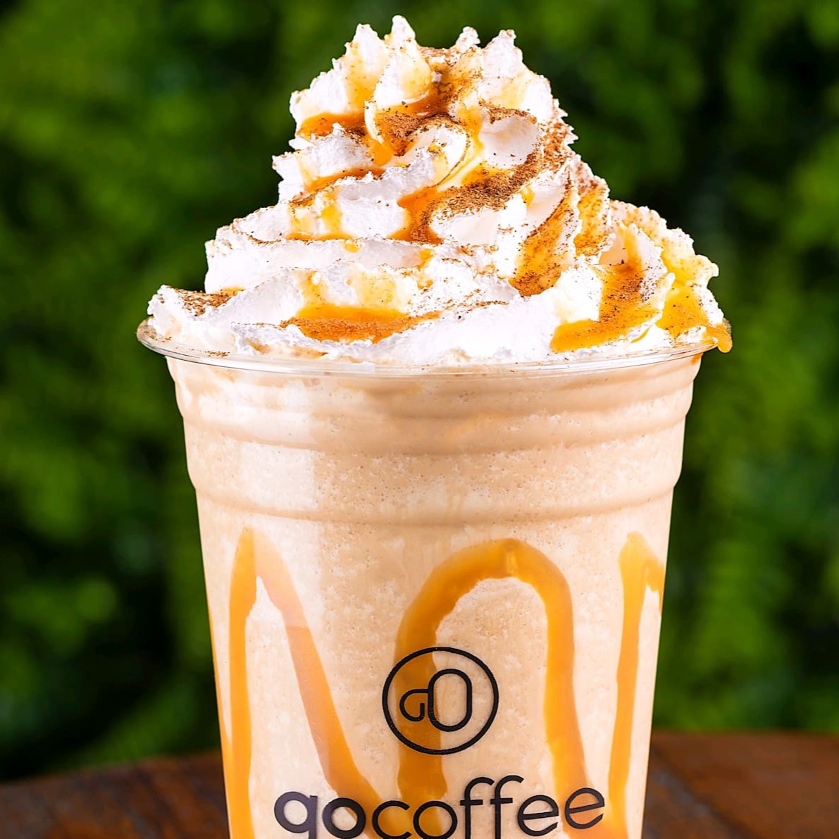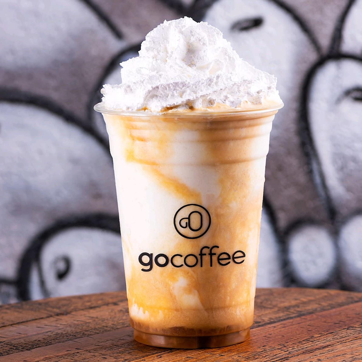 Caramelo \o/ Base café ou creme + syrup + leite + gelo +chantilly + cobertura. Café e chantilly são opcionais. O Chantilly é enviado em um potinho separado.