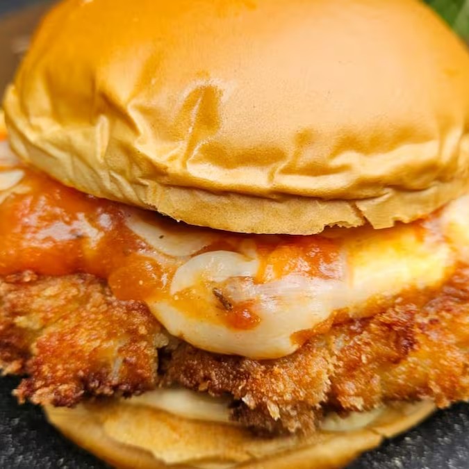 Pão brioche, maionese da casa, sobrecoxa desossada empanado, molho parmegiana e mussarela
