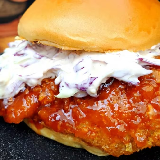 Pão brioche, sobrecoxa desossada empanada, geleia de pimenta e coleslaw
