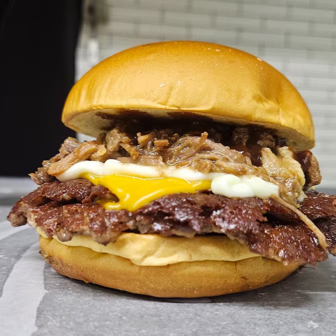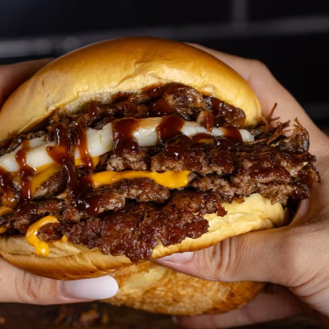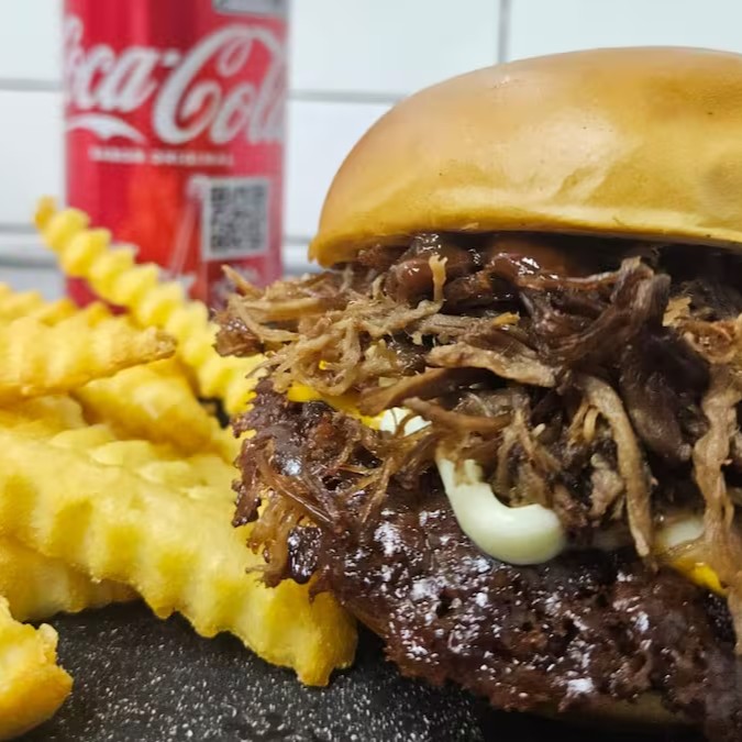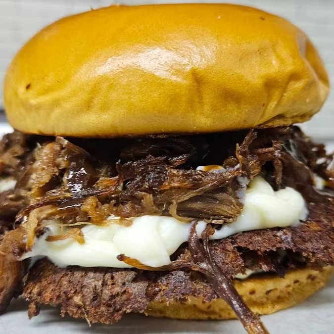 Smash prensadinho na chapa de 70g com Catupiry Original e costela desfiada com um toque de barbecue