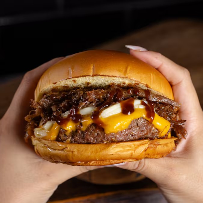 Hambúrguer 90g, queijo cheddar fatiado, costela bovina desfiada, Catupiry Original, barbecue, maionese gk