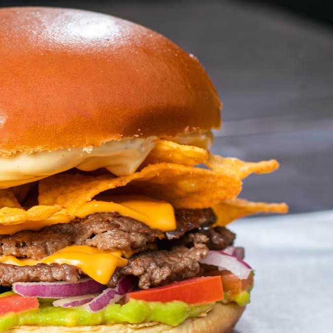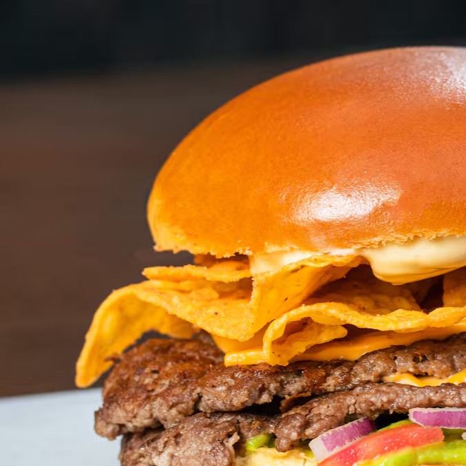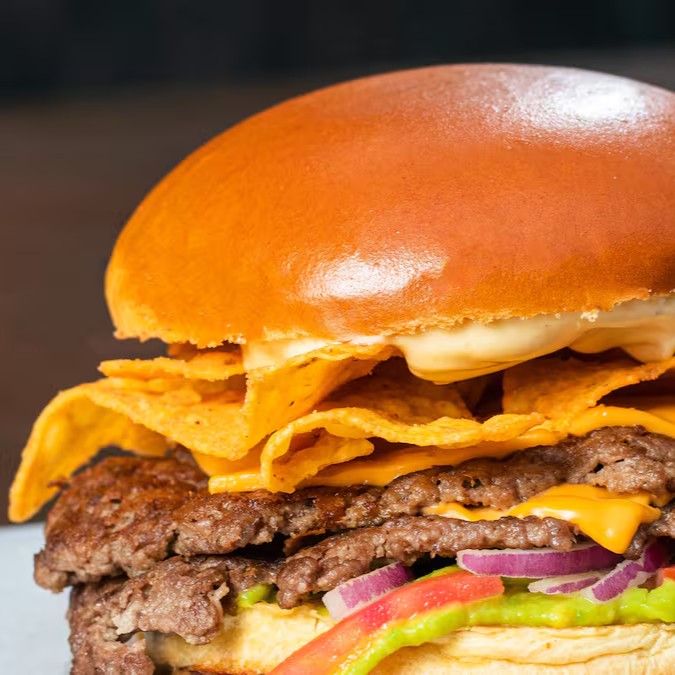 Pão brioche, Grelhado 200g, Guacamole, Cebola roxa, Tomate, Doritos e maionese da casa