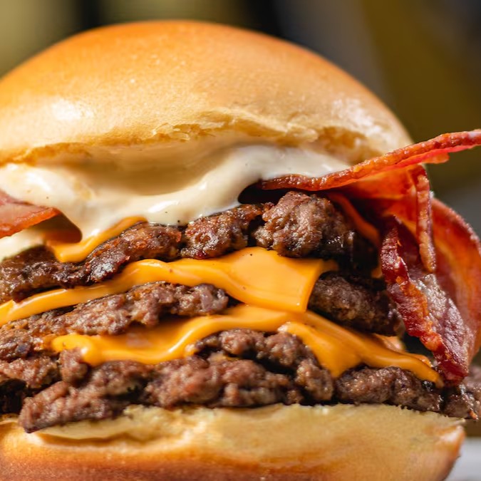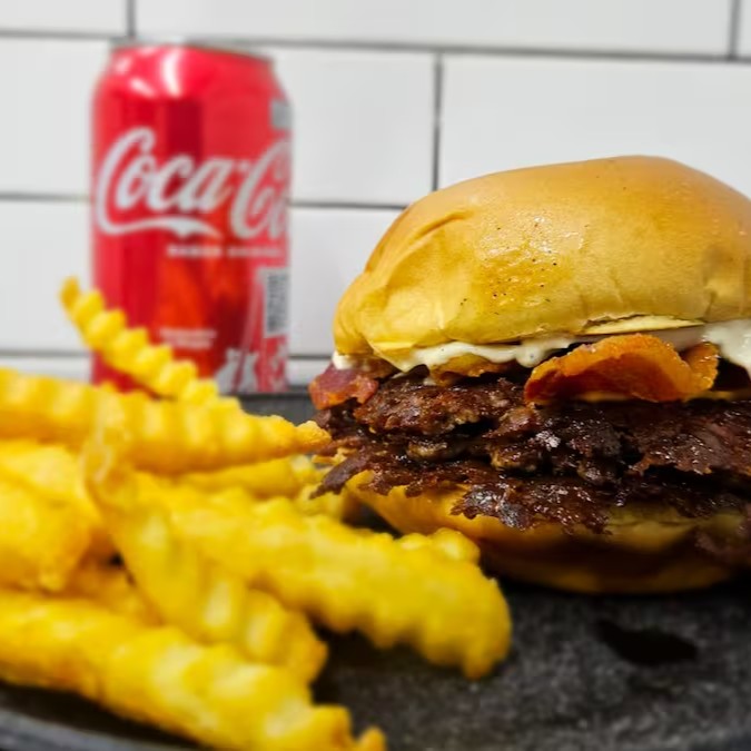 2 Hambúrguer de 70g cada prensado na chapa, bacon defumado, queijo cheddar fatiado e maionese da casa