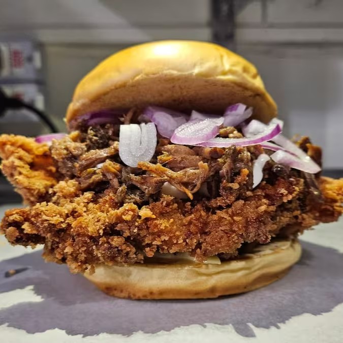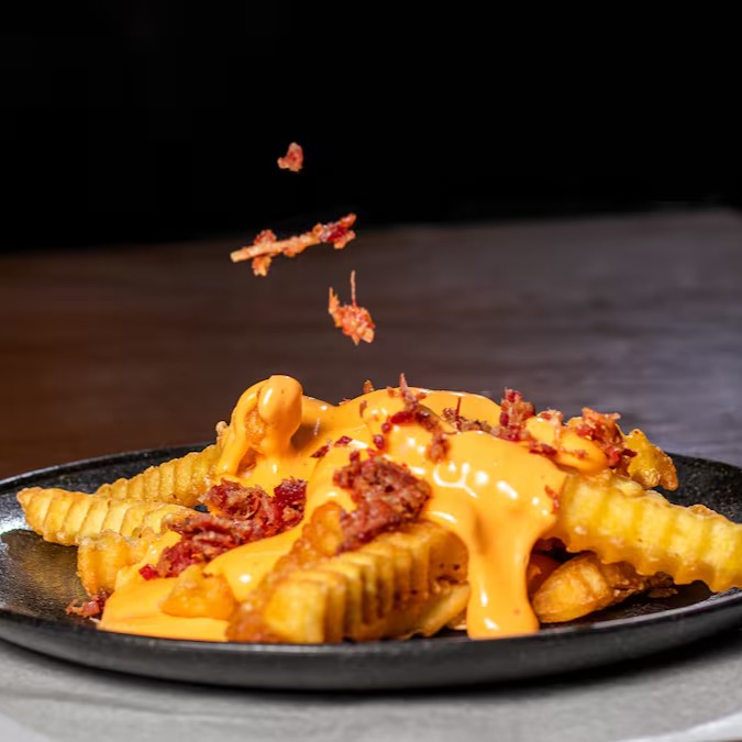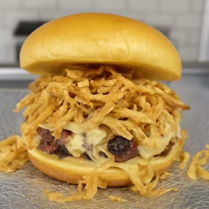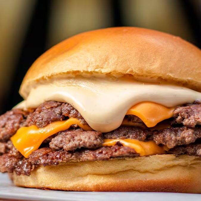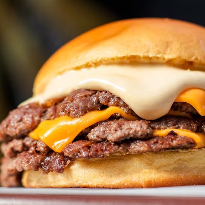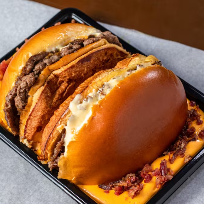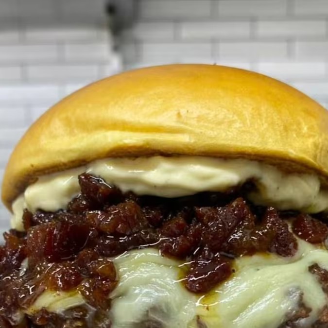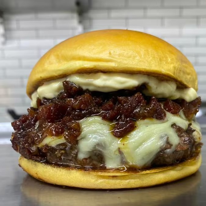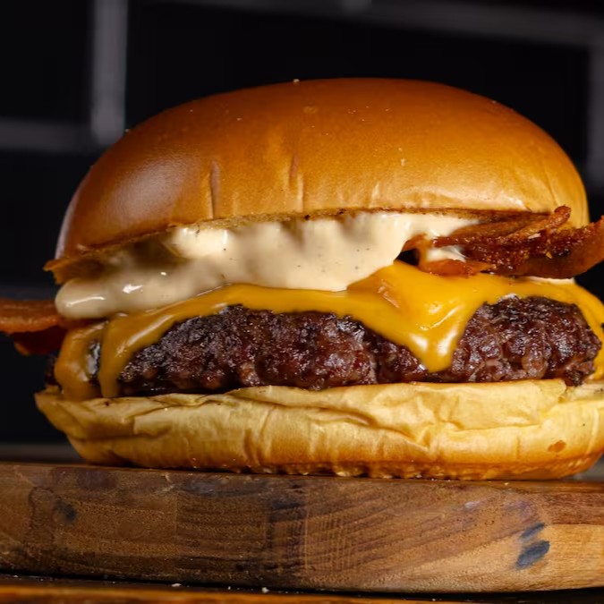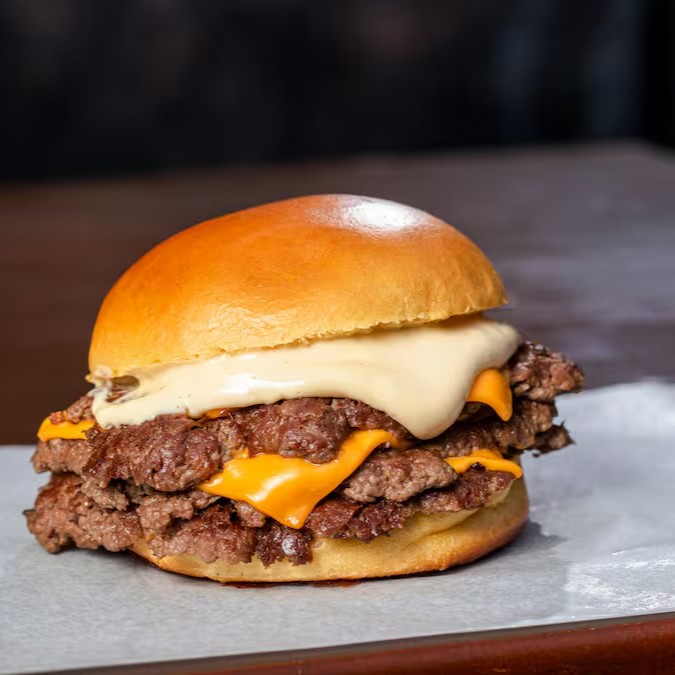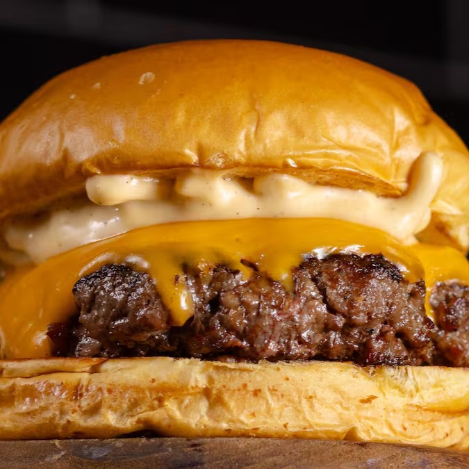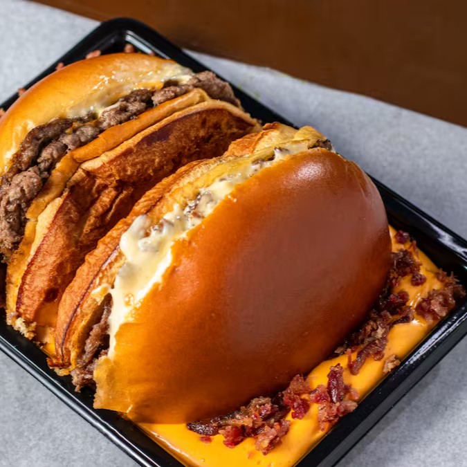 Pão brioche, duplo smash de 70g, queijo cheddar fatiado, maionese da casa, cortado ao meio e mergulhado na piscinha de cheddar cremoso feito na casa com farofa de bacon