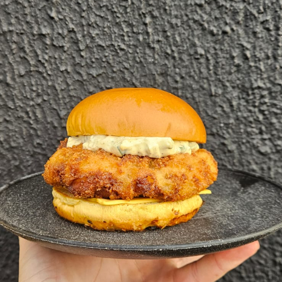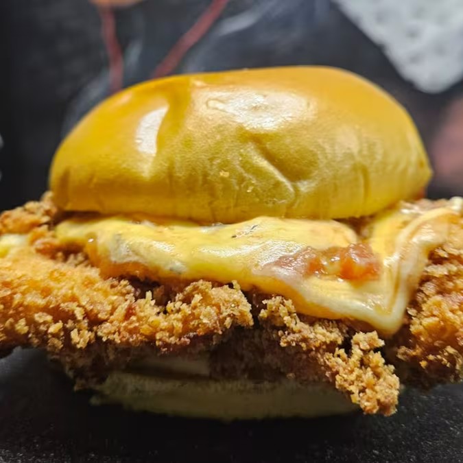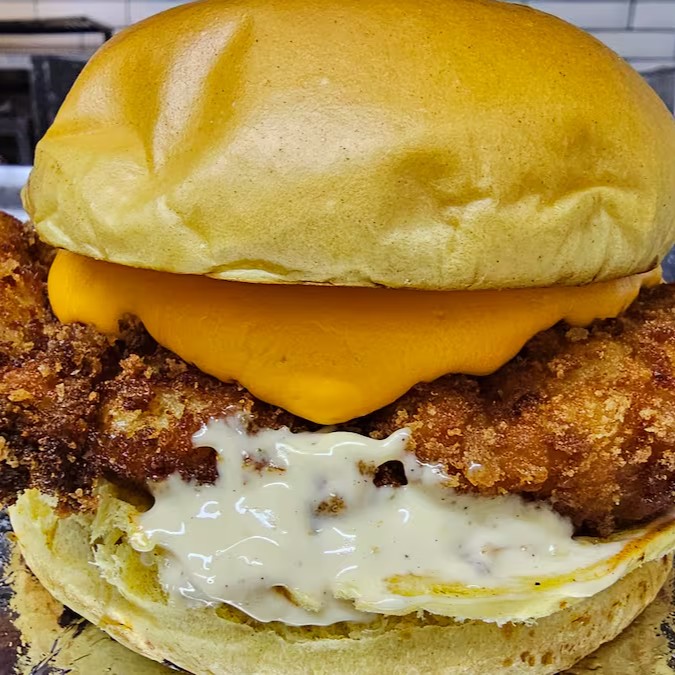 Frangão empanado crocante, cheddar cremoso e maionese da casa