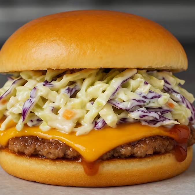 Pão brioche,2 Smash burger 70g, Queijo cheddar, Geleia de pimenta, Coleslaw( Salada de repolho com manga e maionese)