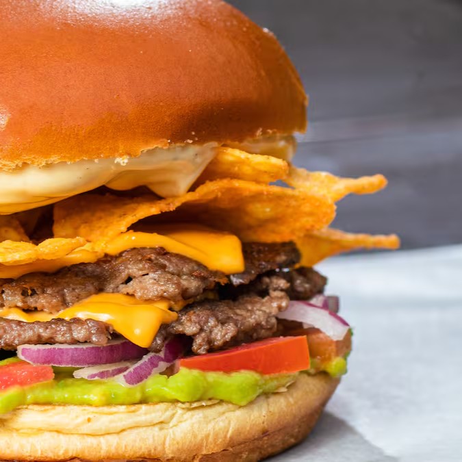 2 Hambúrguer 90g, queijo cheddar fatiado, guacamole (abacate), tomate, cebola roxa, Doritos, maionese gk