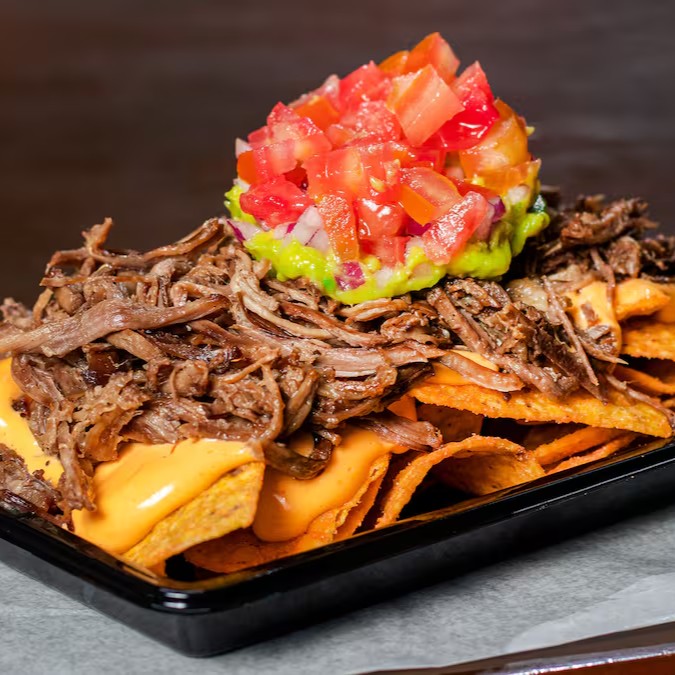 Porção de costela desfiada, Doritos, cheddar cremoso, cebola roxa, tomate e guacamole